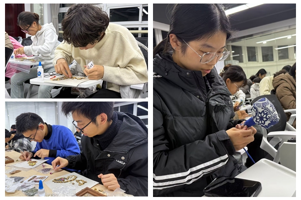 韩玉洁向参与成员播放了中草药香氛画、艾草锤、烧蓝这三类非遗手工作品的制作视频,结合实物展品讲解三苏技艺的历史源流与工艺精髓,从药材特性、艾草选材到银釉配比,每一个关键环节都辅以现场演示,让同学们快速掌握创作要领。创作全程,志愿者分组驻点协助,及时帮助同学们解决药材粉碎不匀、艾草填充过松、釉料涂抹厚薄不均等实操问题,同学们专注于手中的工序,时而交流配色技巧,时而分享纹样灵感,现场洋溢着专注与轻松交织的融洽氛围。