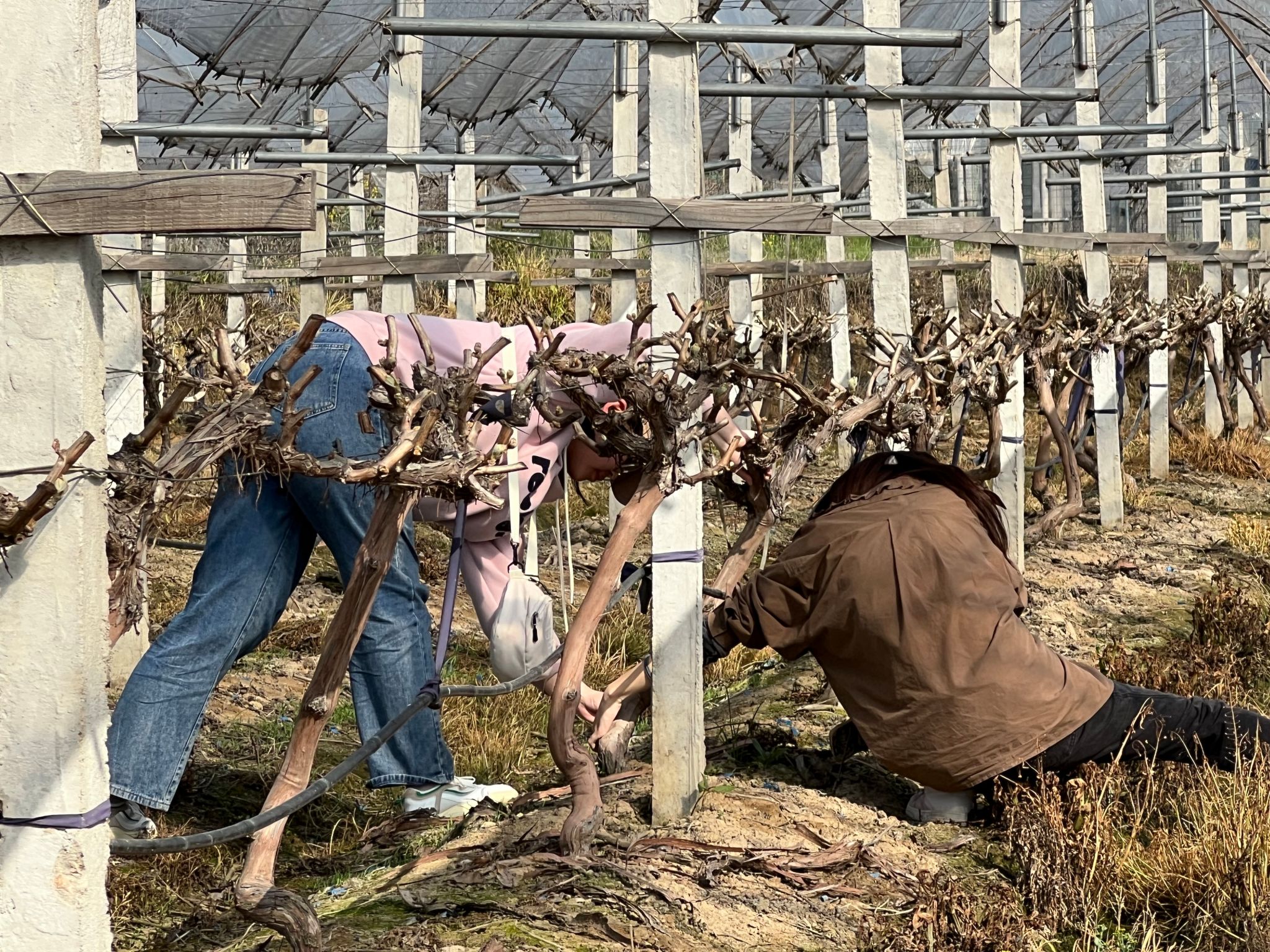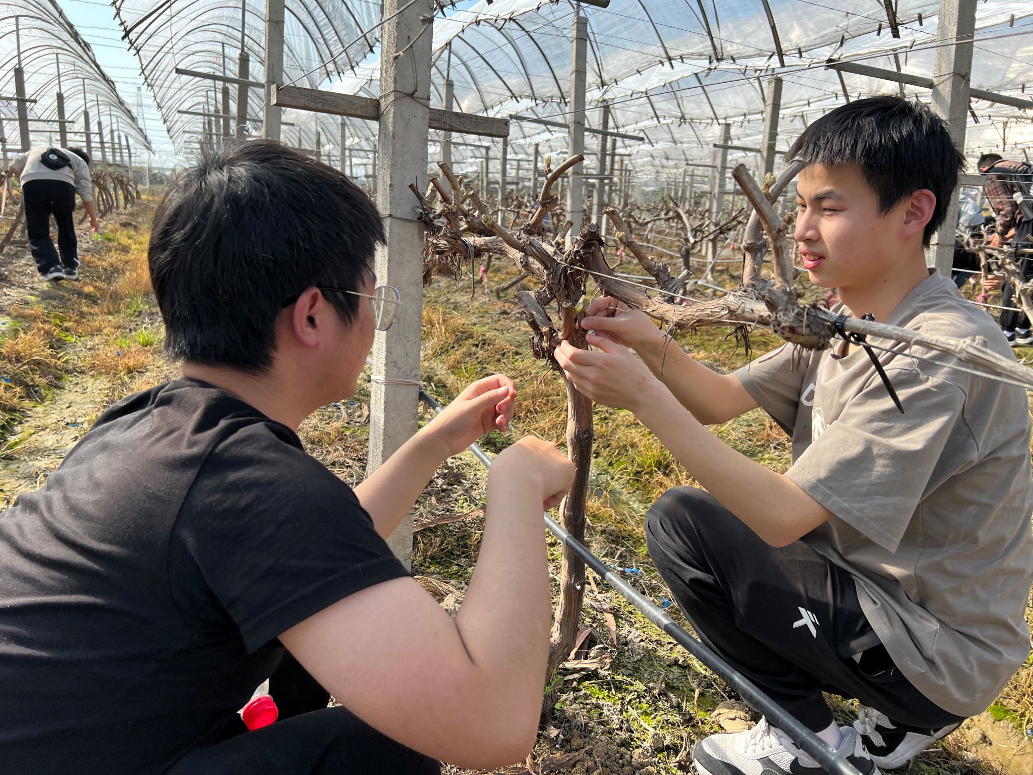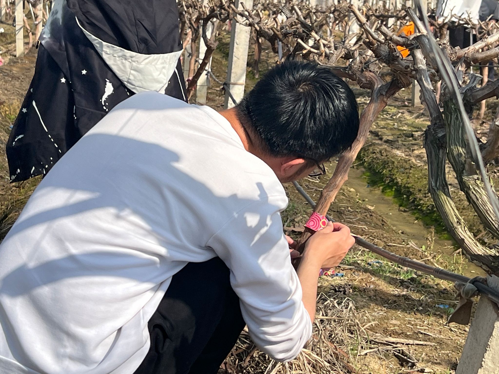 随后,同学们怀着热切的心情纷纷走进田地开展劳动实践。在王文平老师的指导下两人一组,相互协作、积极配合圆满完成了为上千棵葡萄树去皮的任务。
