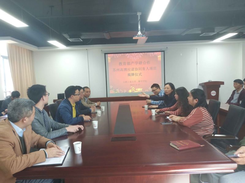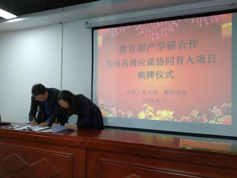 4月17日下午,教育部产学研合作协同育人项目揭牌仪式在翡翠湖校区科教楼B座1710成功举行。会议由公司张莉副经理主持,王青山副经理,殷明教授,凌能祥教授,焦贤发教授,3个专业系部的主任,教师代表,10多名同学代表,以及苏州高博应诺信息科技有限公司总经理于强参加了揭牌仪式。