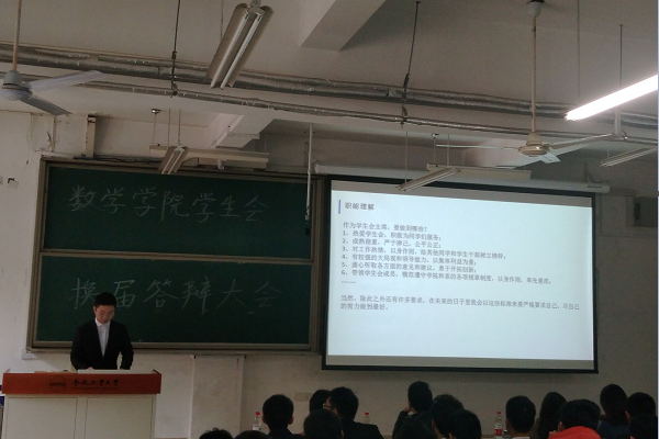 在奏唱团歌后8位竞选同学分别从自身情况、员工会工作收获、岗位认知、工作计划、员工会存在的问题及解决对策等方面进行自我展示。答辩同学张弛有度,各显特色,显现出数学学子蓬勃向上的风采。