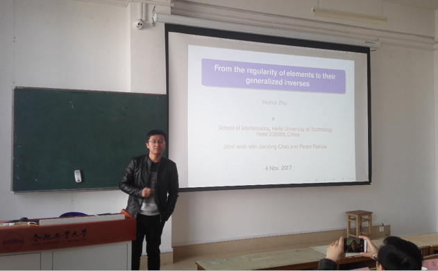 会议伊始,主持人向大家介绍了本次学术交流会的三位主讲人和本次活动的主要内容。首先,马力老师从分数阶微积分的发展历史出发,由常微分的两种约化方法引出分数阶的两种约化方法,并对两种约化方法进行了详细说明,最后结合自身求学经历对研究生的学术学习提出了很多宝贵的建议。接下来,朱辉辉老师从环中相关概念讲起,给出了环中左正则性的定义,相关符号的说明以及环中广义逆需要满足的条件,并展示了其最近所做的相关成果。最后由王浩老师介绍了李代数的相关知识,并给出目前一些较为典型的研究方向,最后对国内一些著名的李代数研究团队进行了简单介绍。会议中同学们积极发问,现场气氛非常活跃,三位老师针对相关问题一一进行了详细的回答。