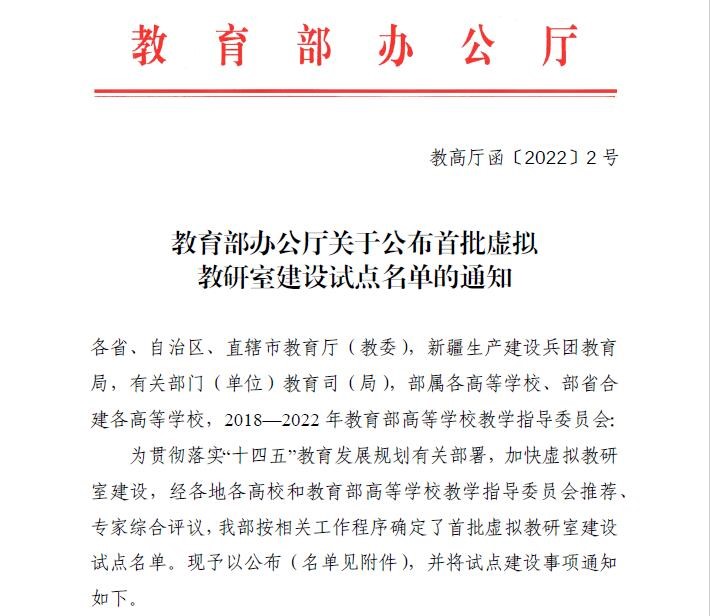 近日,教育部首批虚拟教研室建设试点名单公布,公司牵头申报的《大学数学课程群虚拟教研室》位列其中,获批教育部首批虚拟教研室建设试点。