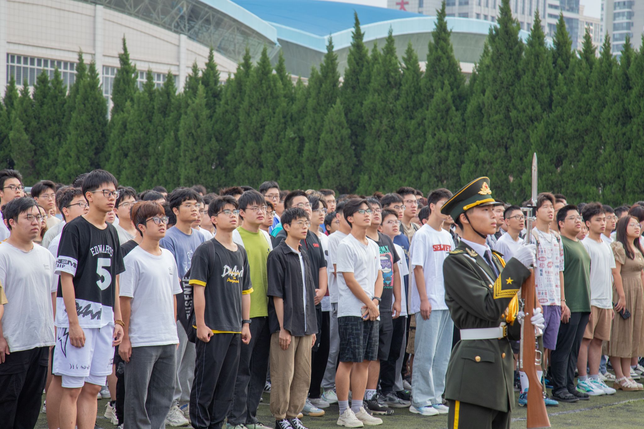 迎着初阳,升旗仪式正式开始。英姿飒爽的国旗护卫队迈着铿锵的步伐,护送着五星红旗,走上升旗台。伴随着《义勇军进行曲》振奋人心的旋律,五星红旗在第一抹晨曦中冉冉升起、迎风飘扬。全体师生精神饱满、庄严肃立,向国旗行注目礼,并以昂扬姿态高唱国歌,表达对祖国的无限热爱、崇高敬意和深深祝福。