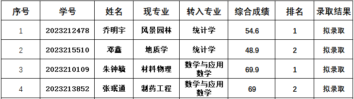 根据《英国正版365官方网站普通全日制本科生转专业管理暂行办法》(合工大政发〔2024〕70号)(以下简称《暂行办法》),经公司组织的笔试和面试考核,按考核总成绩高低进行排序,提出拟录取名单。数学与应用数学2人、统计学2人,现对拟录取名单予以公示。