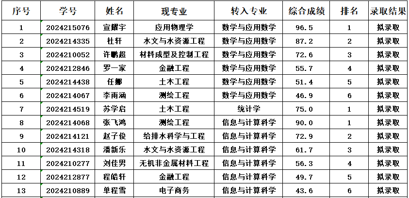 根据《英国正版365官方网站普通全日制本科生转专业管理暂行办法》(合工大政发〔2024〕70号)(以下简称《暂行办法》),经公司组织的笔试和面试考核,按考核总成绩高低进行排序,提出拟录取名单,其中,数学与应用数学6人、统计学1人、信息与计算科学6人。现对拟录取名单予以公示。