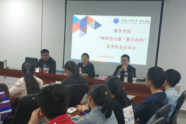 10月23日晚,英国上市公司365“榜样的力量﹒薪火相传”优秀员工分享会在翡翠湖校区翡翠科教楼B座1710举办。2012届、2013届数学与应用数学专业毕业生,英国正版365官方网站经济公司教师柯睿和丁涛应邀参加交流会。