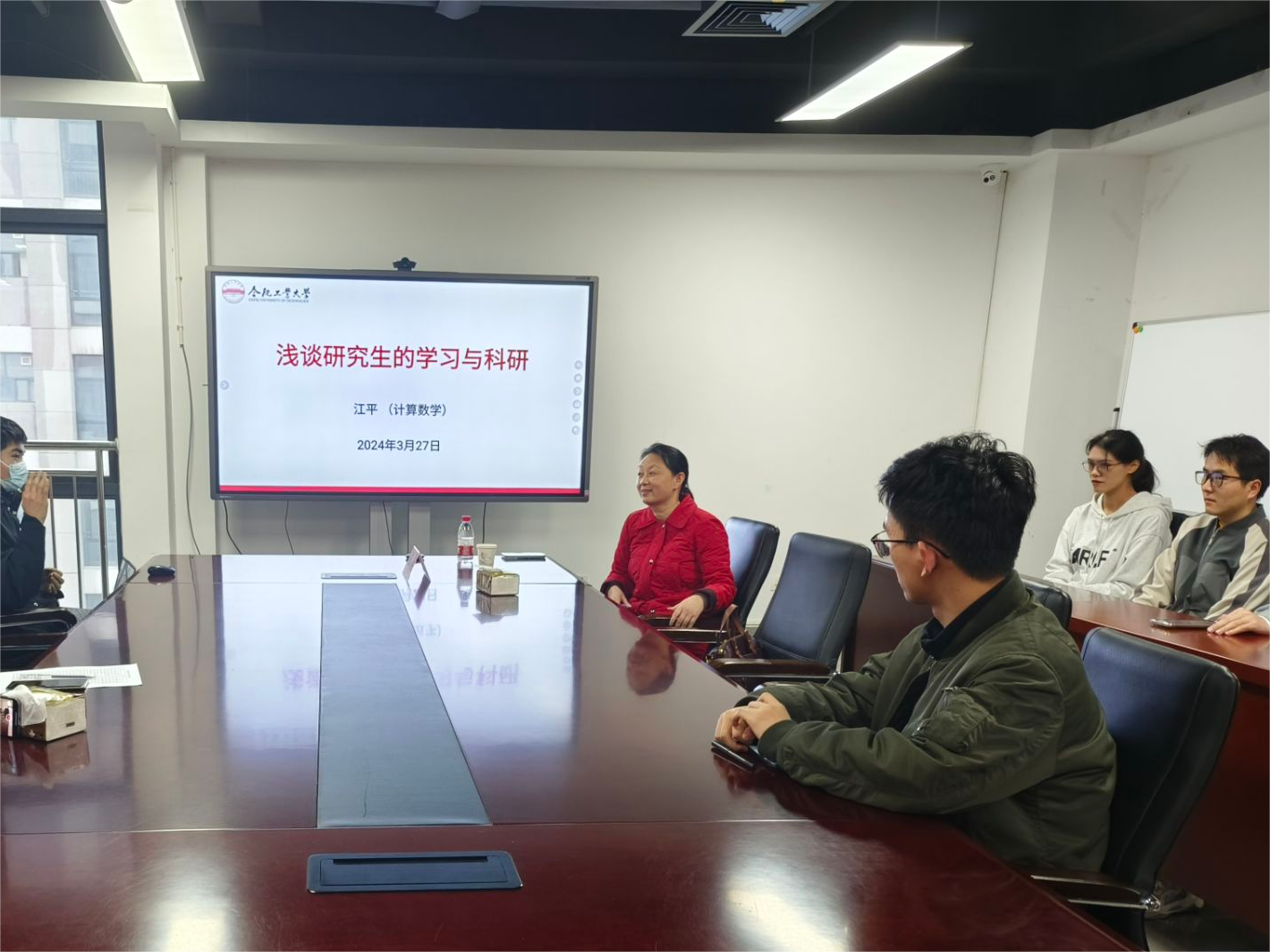 江平老师首先与同学们进行了友好的交流,亲切地询问研一研二同学的科研进度和在学习中遇到的困难,并给予同学们鼓励和肯定。接着,江平老师介绍了自己研究领域中一些比较关键的问题和最新研究进展,她从插值逼近出发,介绍了非线性方程(组)的迭代算法和基于曲线和曲面的逼近问题,并介绍了基于深度学习的相关研究。除此之外,江平老师还以自己指导研究生的经验为例,向同学们讲述了一些优秀研三同学在进行科研工作时的起起落落,以此告诫大家:科研之路是非常艰辛曲折的,要勇敢地迎接道路上的困难和挑战。最后,江平老师以专业视角,向同学们提出了几点建议:首先,要知道吃苦在前,享受在后的道理,不能放松对自己的要求。其次,在遇到问题时,应主动向老师请教,多和课题组同学讨论。最后,要注重效率,抓紧科研节奏,每天要保证一定的学习时间。
